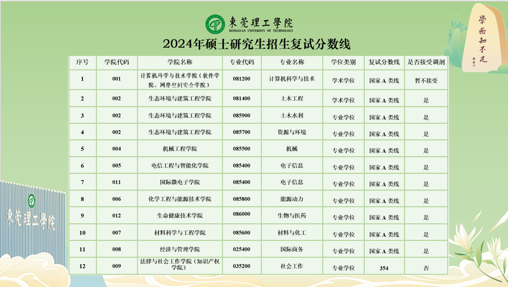 东莞理工学院2024年硕士研究生招生复试分数线是在初试成绩总分及单科均通过国家A类线(国家线)的基础上,按各专业复试人数中最后一名考生的总分成绩确定。