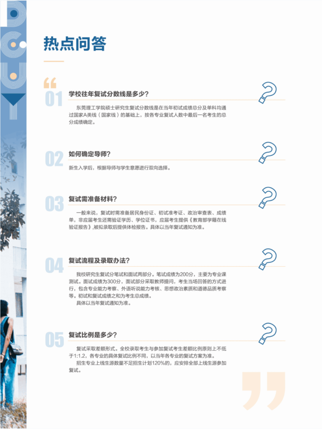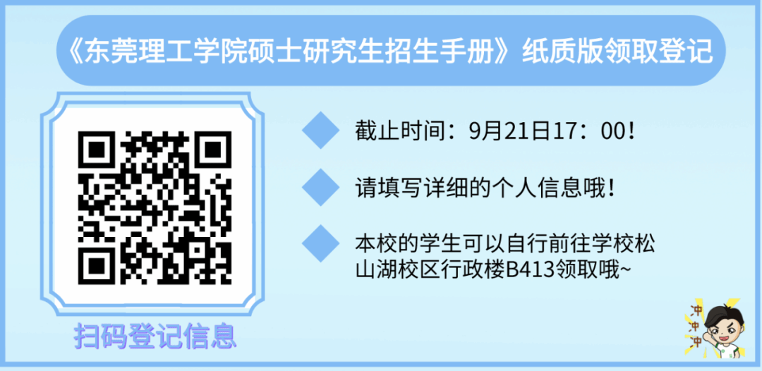 纸质版《东莞理工学院2024年硕士研究生招生手册》即日起可免费领取,邮寄到家啦!如果您需要纸质版硕士研究生招生手册,详细了解我校学科专业、科学研究、招生计划等详细信息,请在9月21日17:00之前,扫描下方二维码填写个人信息,研究生院为您免费邮寄到家哦!
