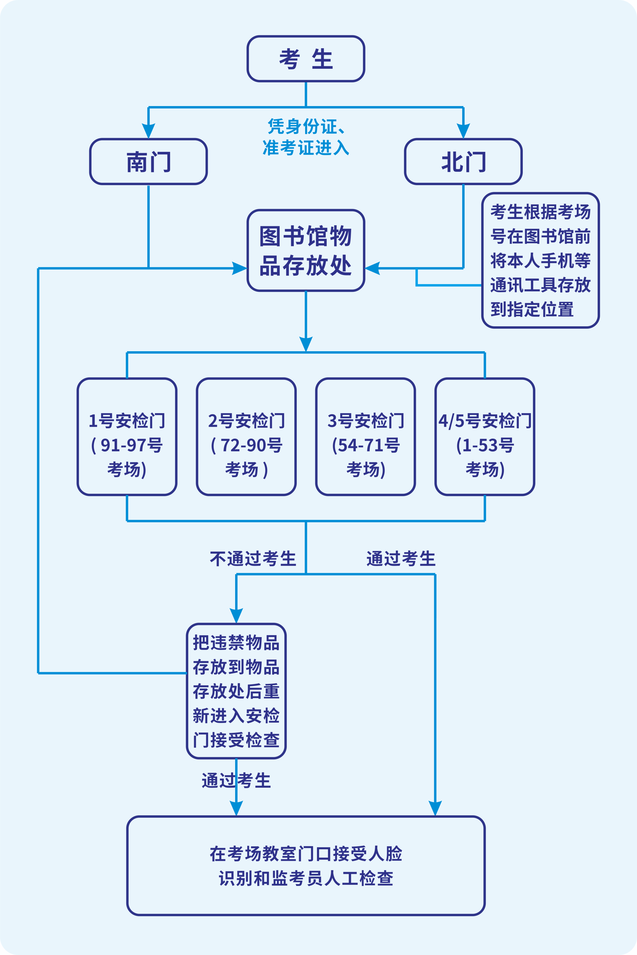考生凭本人准考证、有效居民身份证件进入考点。届时,我校考点开放南门和北门供考生进校,南门步行至考场需要约10分钟,北门步行至考场需要约20分钟,请考生提前规划好到校路线和做好时间安排。