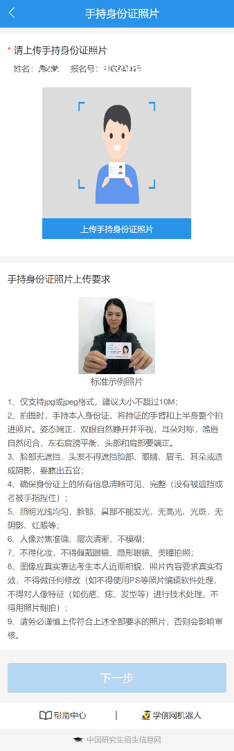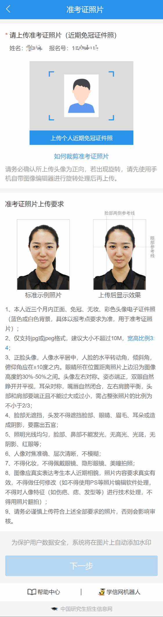 请严格按照准考证照片上传要求(具体要求如下图所示),进行拍摄并上传,点击“下一步”。如考生被录取,该照片将用于人事档案材料以及在学期间相关证件等用途,建议考生使用近期到照相店拍摄的证件照。