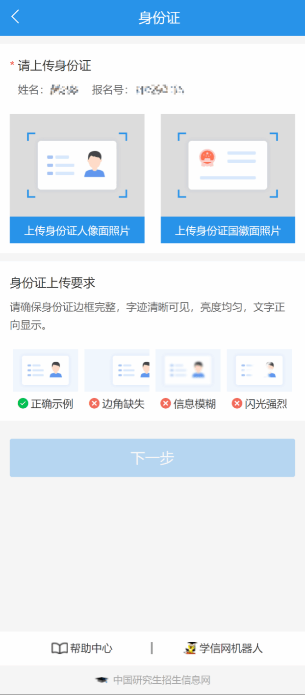 本人有效期内的二代居民身份证原件正面、反面照片各一张,照片要求身份证边框完整,字迹清晰可见,亮度均匀。现役军人考生报考,如没有身份证,须上传军人报考硕士研究生推荐审批表及军官证。