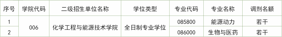 我校能源动力、生物与医药专业还有若干调剂名额。专业调剂系统第二次开放时间初步定于4月10日16:30至4月11日16:30,请有意向报考我校能源动力、生物与医药专业的考生,尽快登录调剂系统(https://yz.chsi.com.cn/yztj/)填报志愿。具体调剂信息公布如下: