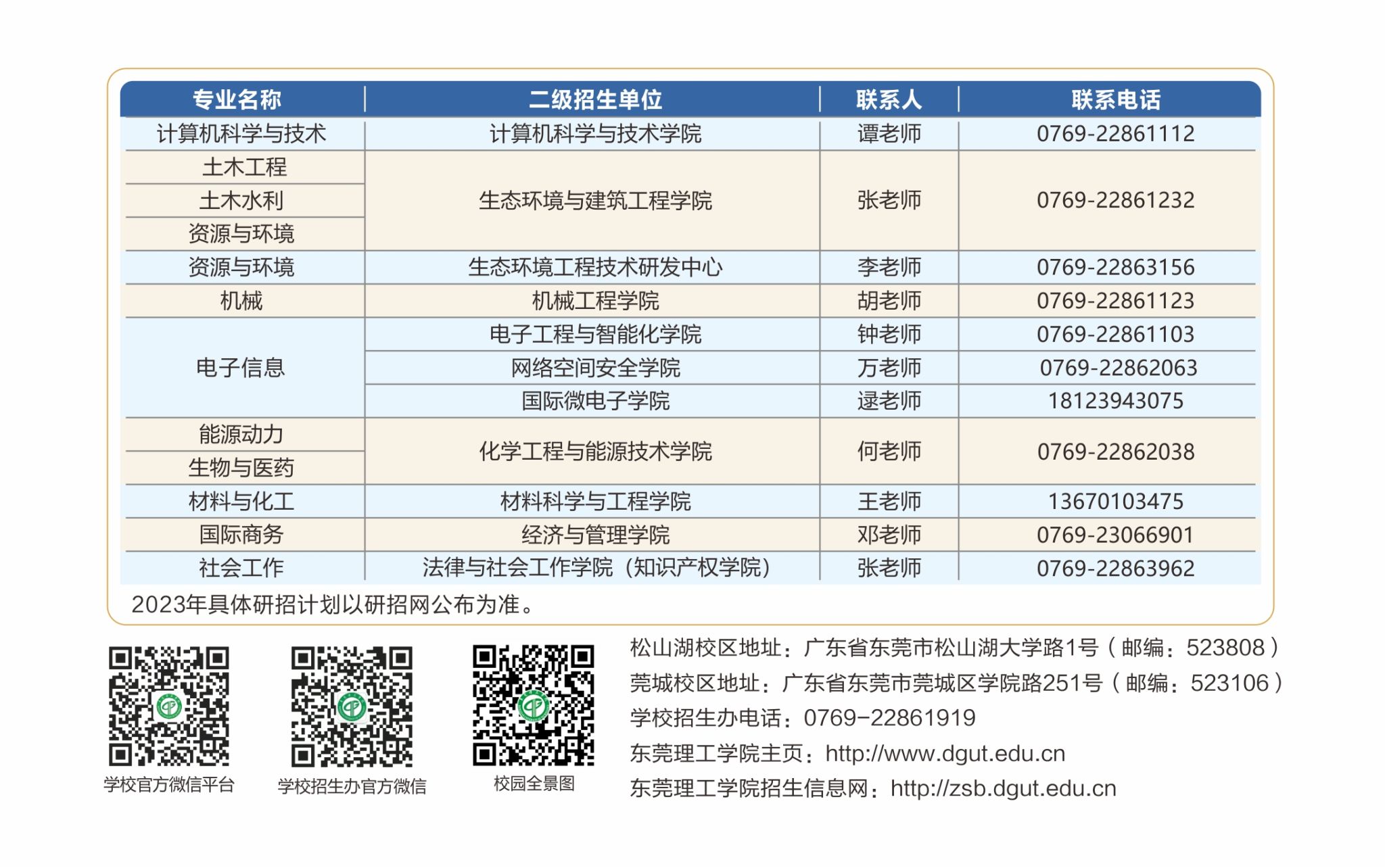 2023年我校共有11个硕士学位授权点招生,其中学术型硕士学位授权点有计算机科学与技术、土木工程,专业型硕士学位授权点有资源与环境、机械、土木水利、电子信息、能源动力、生物与医药、材料与化工、国际商务、社会工作。学校研究生教育培养规模将进一步扩大。东莞理工学院招生办电话:0796-22861919(8:30-12:00,14:00-17:30)