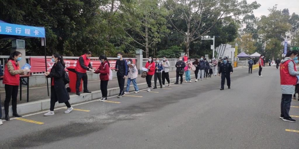为协助做好本次全国硕士研究生招生考试,学校机关党委组织50多位教职工志愿者在南门、北门的入校点值岗,测量体温、检查粤康码等工作,并安排人员在考场周围的网格点为考生服务。因上级要求,今年每位考生进入考场均需提供14天健康信息申报表,学校在网格点还安排了电脑与打印机,为忘记打印申报表的学生免费打印表格。