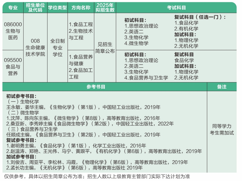 二级招生单位:生命健康技术学院